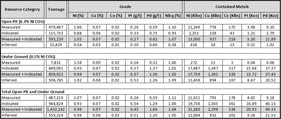 On a Nickel Equivalent basis (“NiEq”), this Measured & Indicated Resources of 31.3M pounds at 0.98% Ni, works out to 33.2M NiEq pounds (2.2x the 2010 historical estimate on a NiEq basis) and the Inferred Resources of 12.1M pounds at 0.98% Ni works out to 12.9M pounds (3.8x the 2010 historical estimate on a NiEq basis).